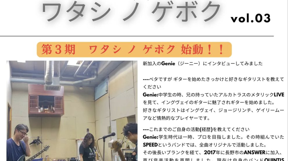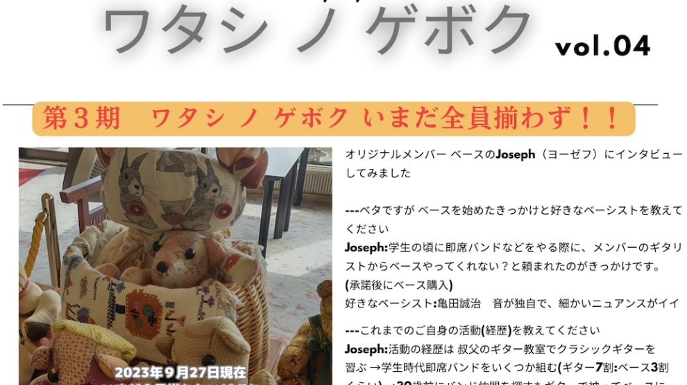 第3期 ワタシ ノ ゲボク いまだ全員そろわず!! 今回はベーシストのJosephにスポットを当ててみました。 我々も知らなかった話が聞けました(笑) 次回は?その前にいつ全員揃うのでしょうか(笑) 予定されているライブははたして。。。